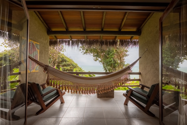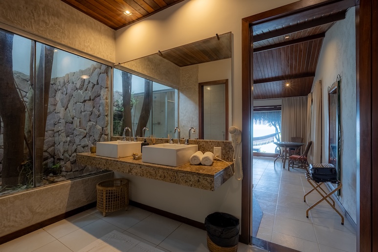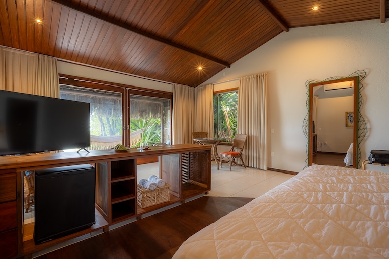 Possui 60m², equipado com ar condicionado split, minibar, telefone com discagem direta, Smart TV, wi-fi, cama de casal King Size, banheiro box com ducha quente por aquecimento solar, secador de cabelo, espelho para maquiagem, amenities, cofre (custo adicional), armário e varanda com rede.