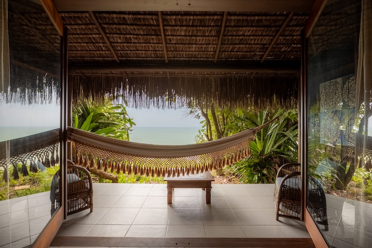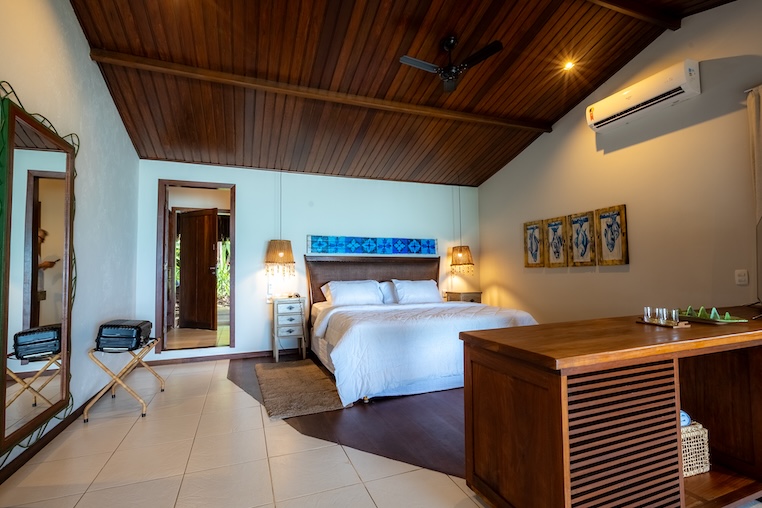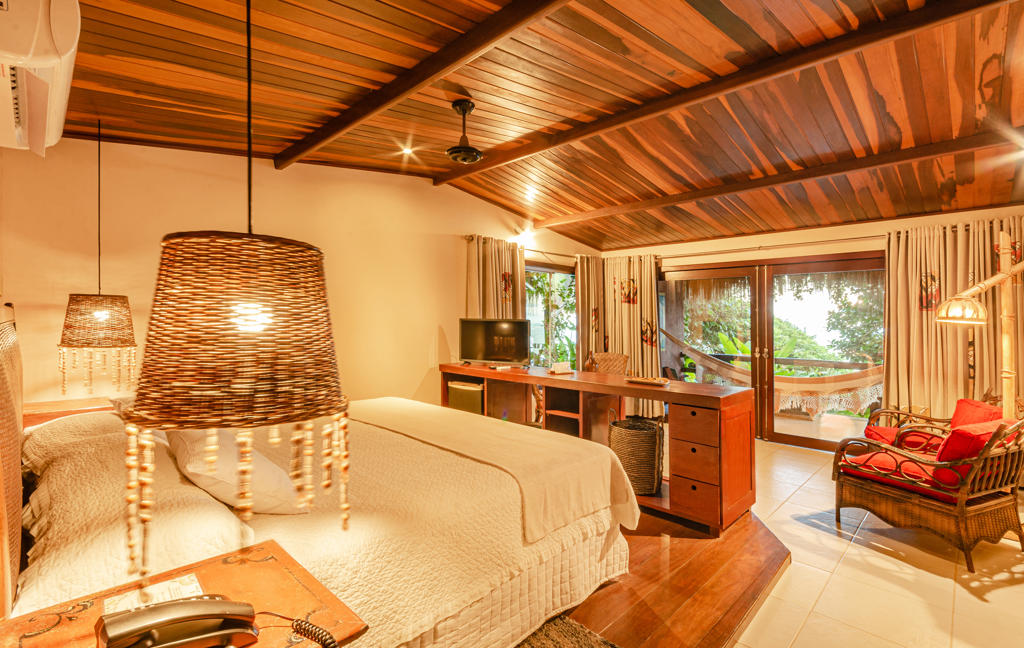 Possui 60m², equipado com ar condicionado split, minibar, telefone com discagem direta, Smart TV, wi-fi, cama de casal King Size, banheiro box com ducha quente por aquecimento solar, secador de cabelo, espelho para maquiagem, amenities, cofre (custo adicional), armário e varanda com rede.